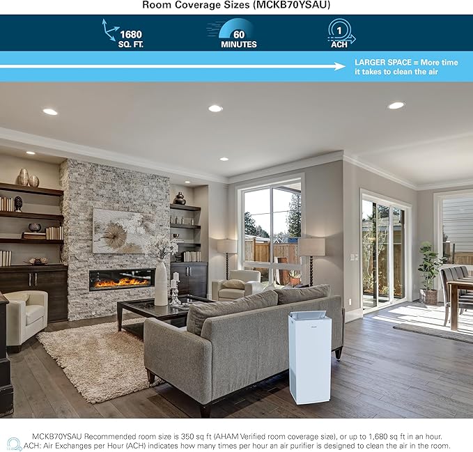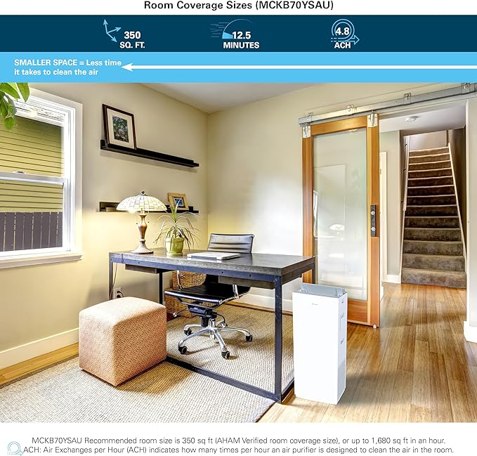 - CLEAN AND FRESH AIR: With 3 directional air suction and a powerful purification system, this air purifier cleans the air in a room size of 350 sq ft at 4.8 air exchange rate (AHAM Verified room coverage size), or up to 1,680 sq ft in an hour.