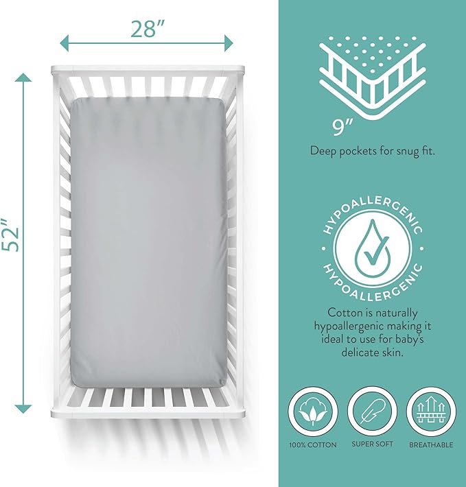 - Secure fit & Deep Pockets: Designed with fully encased, premium elastic along the entire bottom edge and 9" drop size for securing tightly over the corners. Each Fitted Crib Sheet is 52” x 28” in size for standard crib & toddler mattresses.