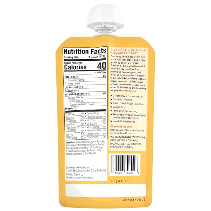 - ORGANIC BABY & TODDLER FOOD POUCHES - Our Carrot Pumpkin baby food pouches were created by a devoted mother who is also a neurosurgeon and a doctor in developmental neurobiology. After years of trial and error, she developed the perfect baby squeeze pouches made with whole, organic ingredients and backed by scientific nutritional studies. Cerebelly's toddler and baby food puree pouches are the best meal or snack for your child’s growing brain.