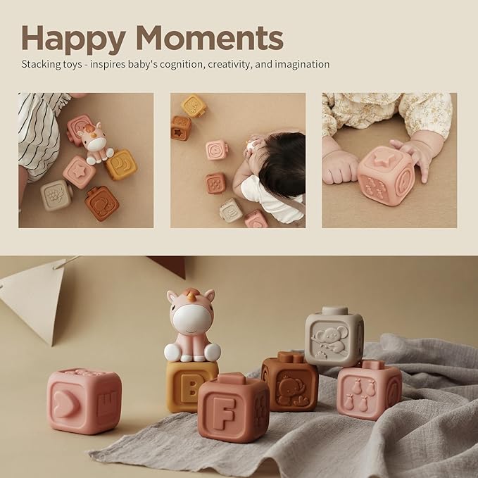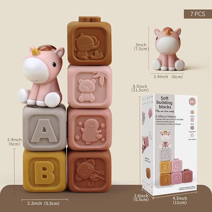 Nueplay 7 Pcs Soft Building Blocks, Sensory Stacking Squeeze Toys with Horse Figure, Newborn Essentials for 6 12 18 Months Baby Toddler Girls