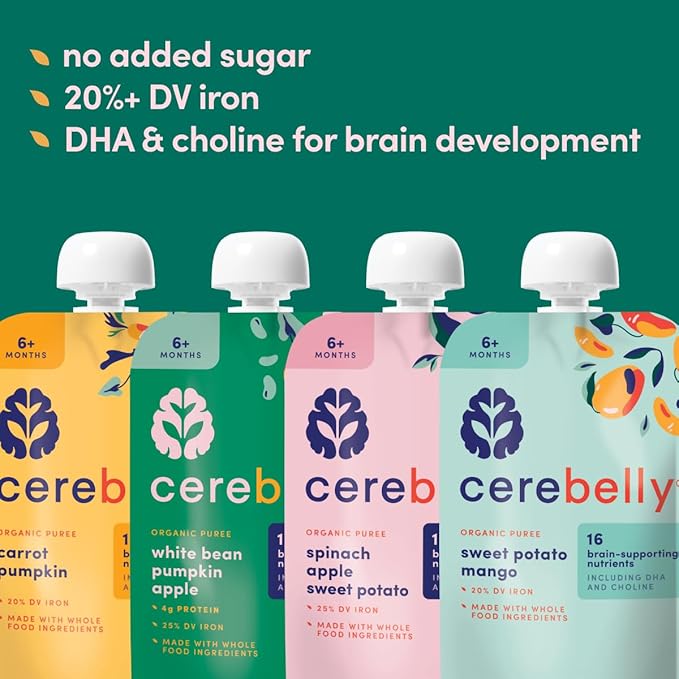 - BRAIN SUPPORTING NUTRIENTS - Cerebelly baby puree pouches are the only organic fruit and veggie pouch that delivers 16 brain-supporting nutrients that play a pivotal role in your child's cognitive development. With 35% of their daily value of Potassium, 25% daily value of Iron and 30% daily value of Vitamin D, these pouches pack a punch!