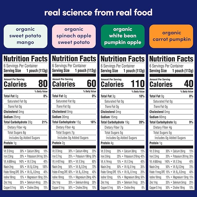 - VEGGIE FIRST, ORGANIC INGREDIENTS - Our BPA-free and Non-GMO organic baby pouches are crafted from whole foods like hearty pumpkin, apples or mangos! No added sugars, preservatives, gluten, dairy or nuts; our organic fruit and veggie pouches give your baby what their brain and body needs, right from the start.
