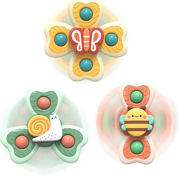 - Lovely Shape - The versatile suction spinner toys includes everything baby need for a fun-filled day.3 different cute insect shapes suction cup spinner toys with baby rattle, which can easier to attract toddler’s attention and arouse their interest.The suction cup has been fixed and will not be opened by the babies.