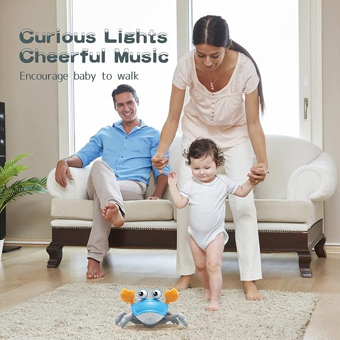 - Baby Happy Tummy Time Toys: Our crawling crab toys make tummy time fun and happy. Bright colors, sparkling lights, cheerful music and sideways walking are right in front of babies 0 to 6 months, attracting their attention, they love listening to music and can't help waving their arms and legs following the music. it's not only a great toy for babies to exercise their muscles, but serve as valuable learning systems to enhance their motor skills development