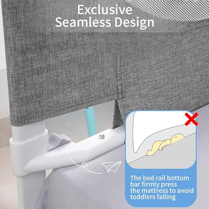 - Seam-Conscious Bottom Bar – The base bar is designed to press firmly against the mattress, aiming to reduce gaps that could otherwise create a risk of entrapment. (Note: The rail is intentionally sized about 1–1.5 inches shorter than the mattress length to help improve the fit. Please confirm mattress dimensions before purchase.)