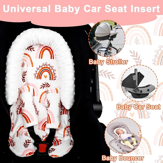 - BABY HEAD SUPPORT AND STRAP COVER SET: Our rainbow car seat head support for newborn is designed for babies as they grow and is also perfect for baby carseat,strollers, and bouncer seats. Perfect worked with both 3-point and 5-point harness systems in most baby car seats