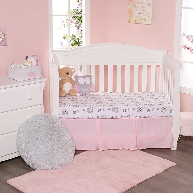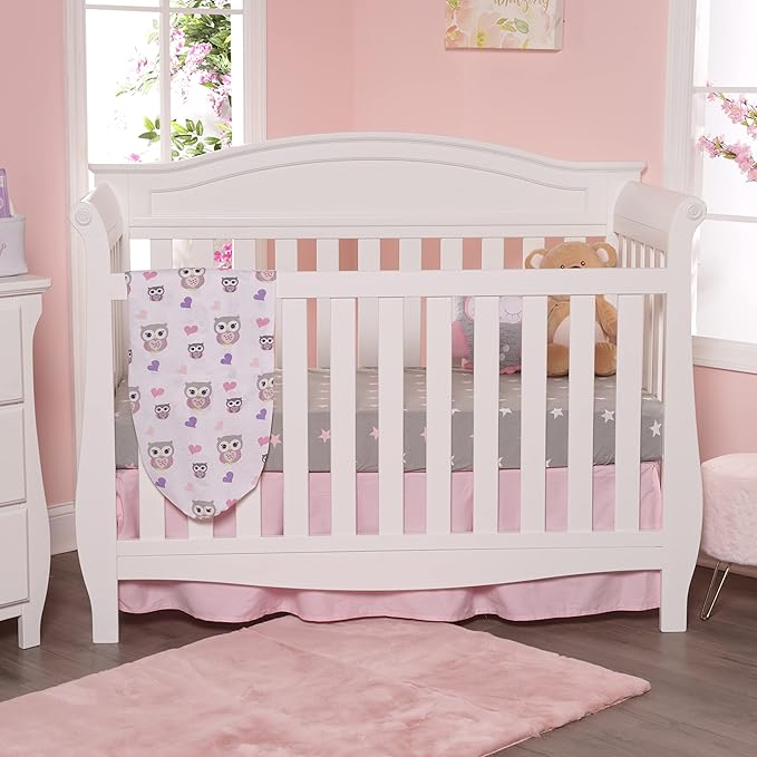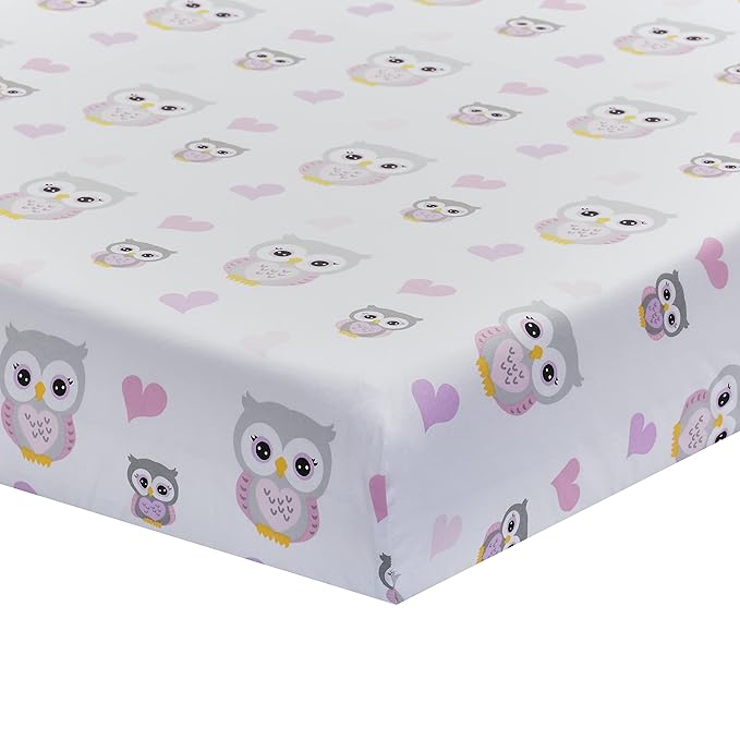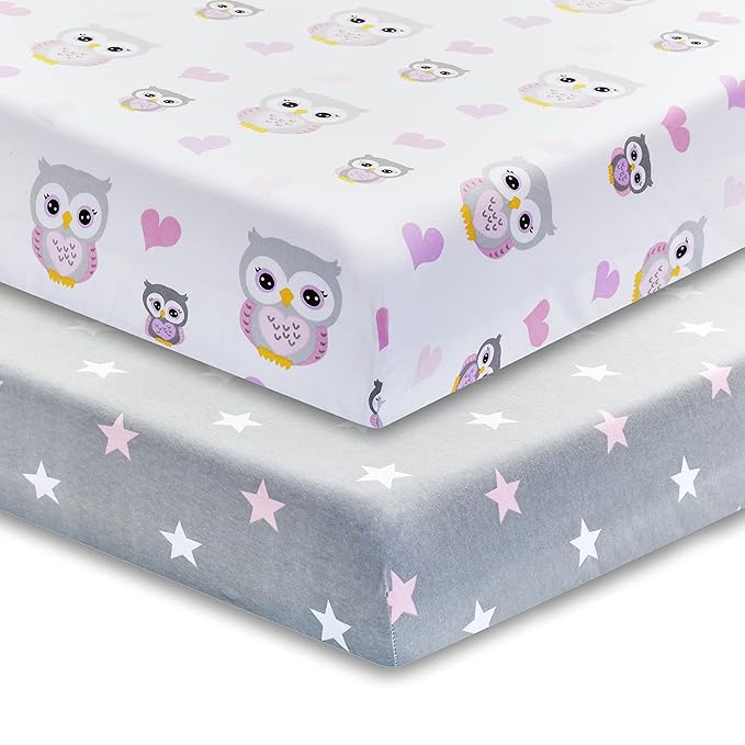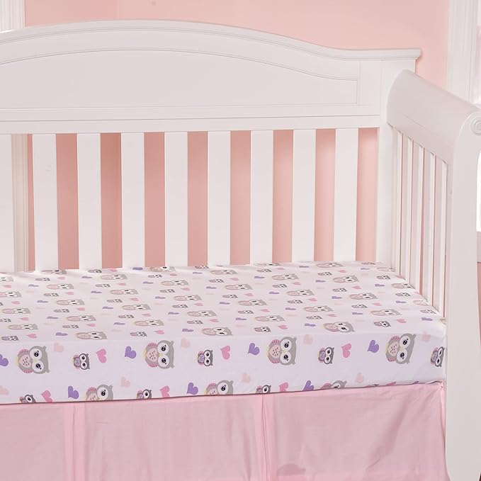 2 Pack Fitted Crib Sheets for Girls in 100% Jersey Knit Cotton – Girl’s Crib Mattress Sheets with a Nature Theme of Owls with Purple and Pink Hearts and a Gray Sheet with Pink Hearts by Everyday Kids