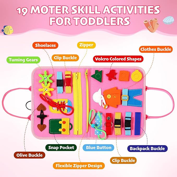 - 【Learn Basic Life Skills】The Fine Motor Skills Toys for 1 Year Old NOT ONLY feature 19 Basic Life Skills Activities: zippers, shoelaces, buttons, belt buckles, etc. BUT ALSO add interesting montessori toddler activities: jigsaw puzzles, clocks and calendar learning games, which help toddler natural learning through play: develop Fine Motor Skills, Hand-eye Coordination and Cognitive development.
