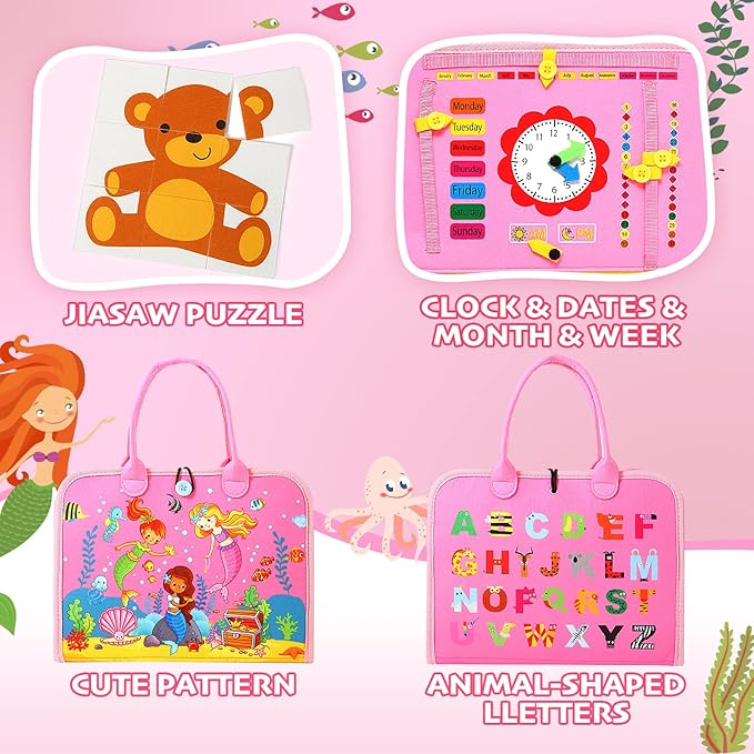 - 【Montessori Busy Board】Hooku Toddler Busy Board feature 4 different pages of activities to developing fine motor skills, plus an animal-shaped alphabet and lovely mermaid on its front & back covers. In addition, the flexible zipper allows it to divide into 2 busy boards so 2 kids can play together!