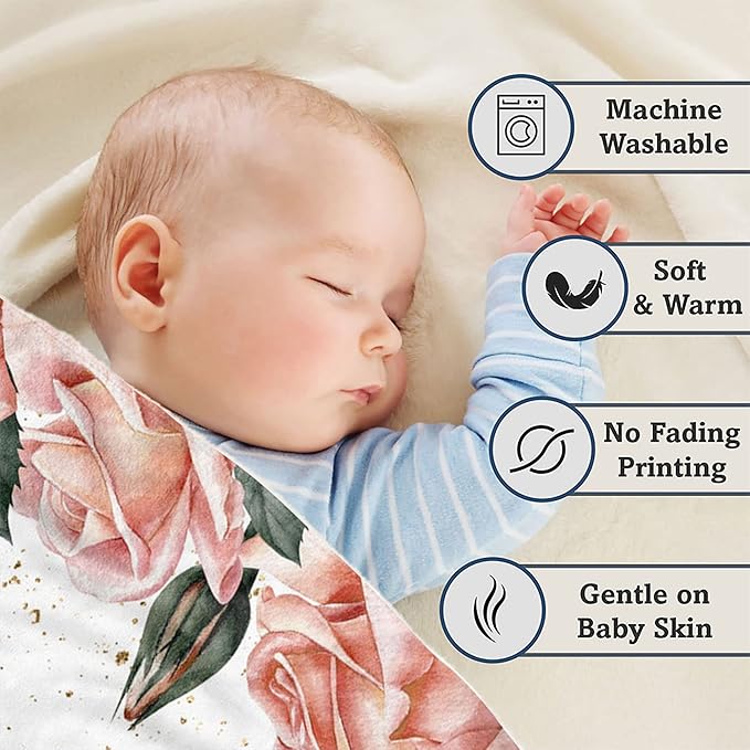 Floral Personalized Baby Blankets for Girls, Customized Baby Blankets for Girls, Best Gift for Baby Girl, Newborn, New Mom, Super Soft Plush Fleece, 30''x40'' Rose