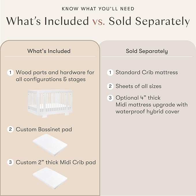 - Includes Conversion Kits & Pads: No need to purchase extra parts - this baby crib convertible toddler crib has all the necessary hardware, a 1” bassinet pad, and 2” midi pad, ready for every stage. Add a Babyletto full-size mattress (M5321C sold separately) to complete the look.