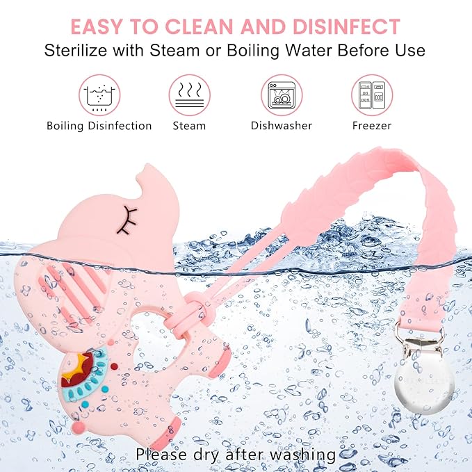 - Easy to Clean: Cleanup is a breeze. Simply clean with soapy water or wipe with a wet cloth, or throw it in the dishwasher or boiling water for a deeper clean! Your baby will be back to their favorite teether in no time!