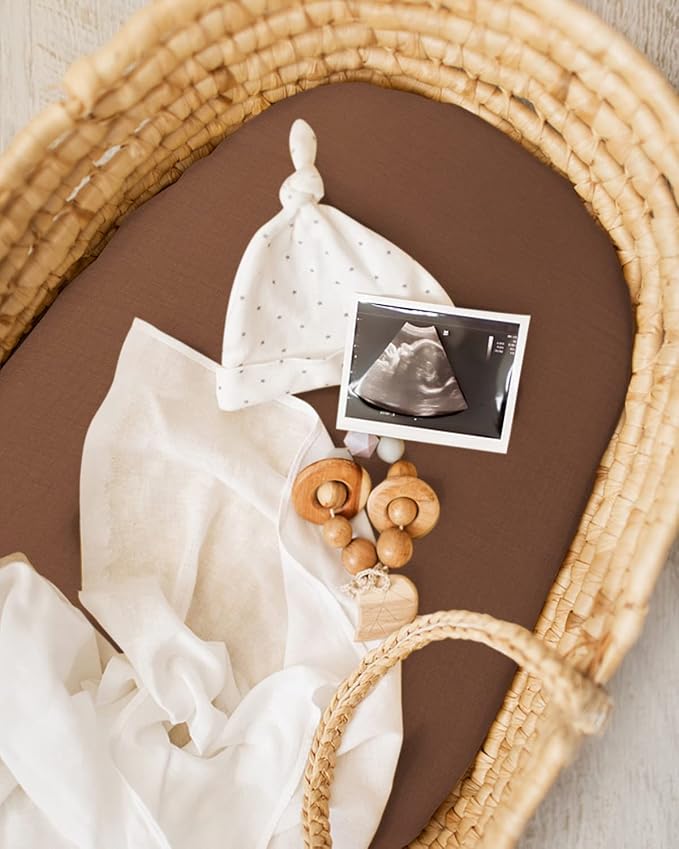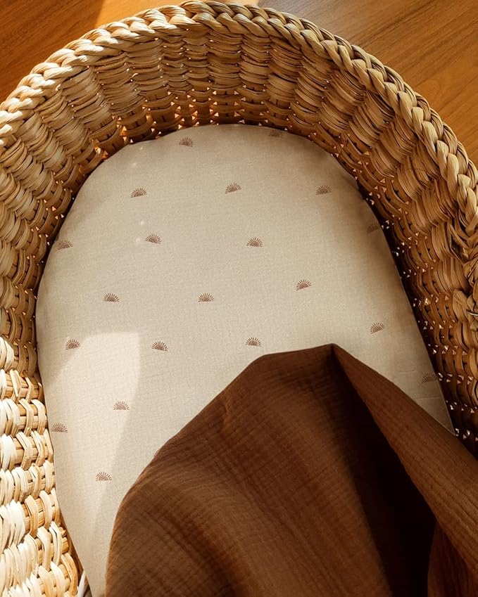 Blissful Diary Muslin Bassinet Sheets for Baby Girls Boys, Boho Soft Cotton Fitted for Oval Hourglass Rectangle Mattress, 2 Pack(Sunshine&Brown)