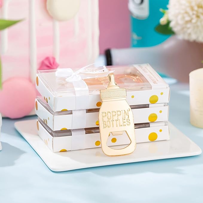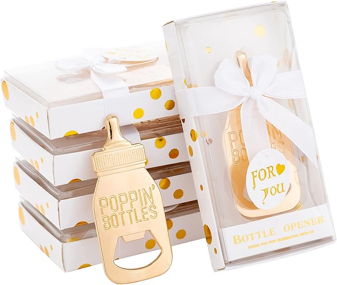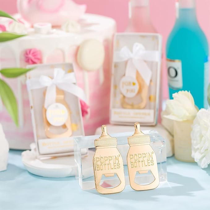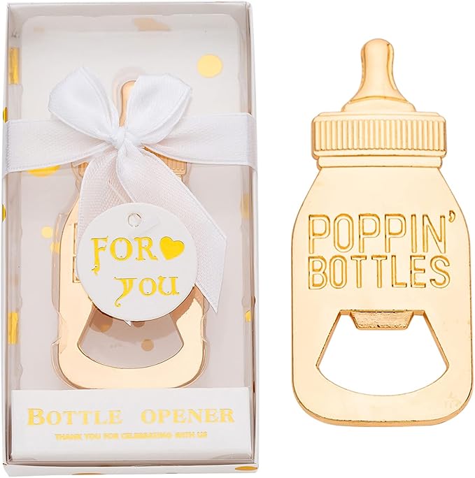 - Stylish"POPPIN" Design: Baby bottle opener is cute and unique ! This Baby bottle opener making your little prince or princess more meaningful and memorable.Creative production:Baby shower feeding bottle opener favors packed in a gift box, which will be great for a unique gift that will make your family and friends surprised for a long time