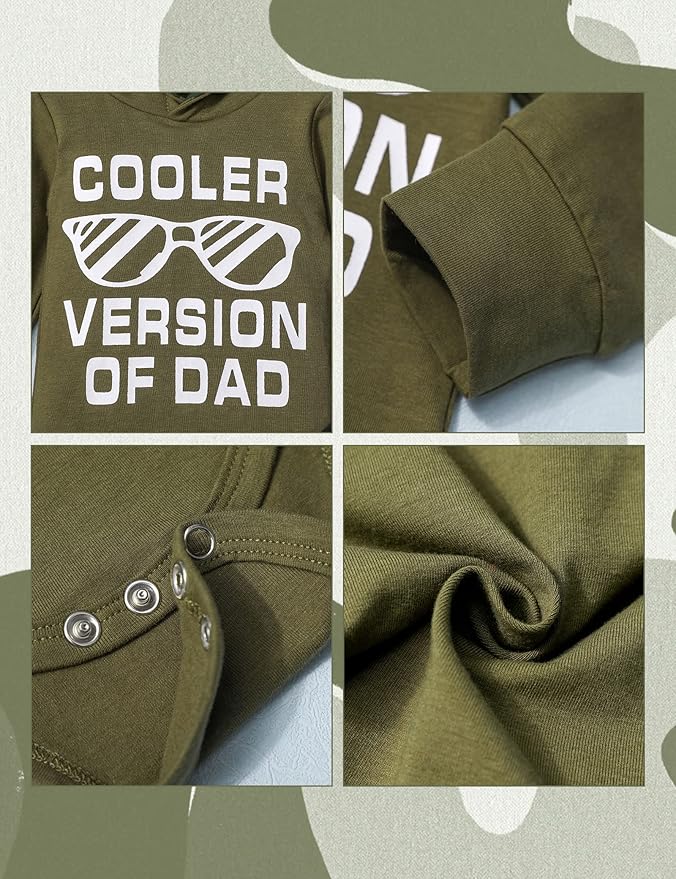 - ⭐ Unique design: baby boy hoodie design can be a good protection for baby boy's head in winter. Long-sleeved top printed with the words "cooler version of dad" is the best gift parents can give their babies. Military green tops make your baby boy more handsome, the lower end of the jumpsuit with buttons designed for easy opening and closing to change newborn diapers is something for the baby, camouflage pattern pants can be a good protection for the baby's legs.