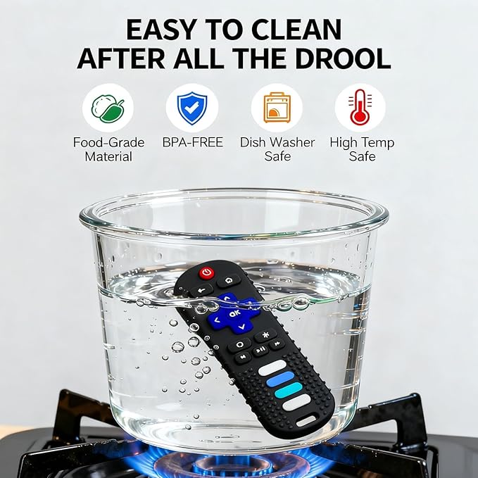 - Dual Benefits: Teething Relief & Early Learning:Soft remote-control shaped teether soothes sore gums (even better when chilled!). Backside graphics help babies learn shapes, while bright vibrant colors attract attention and boost hand-eye coordination.