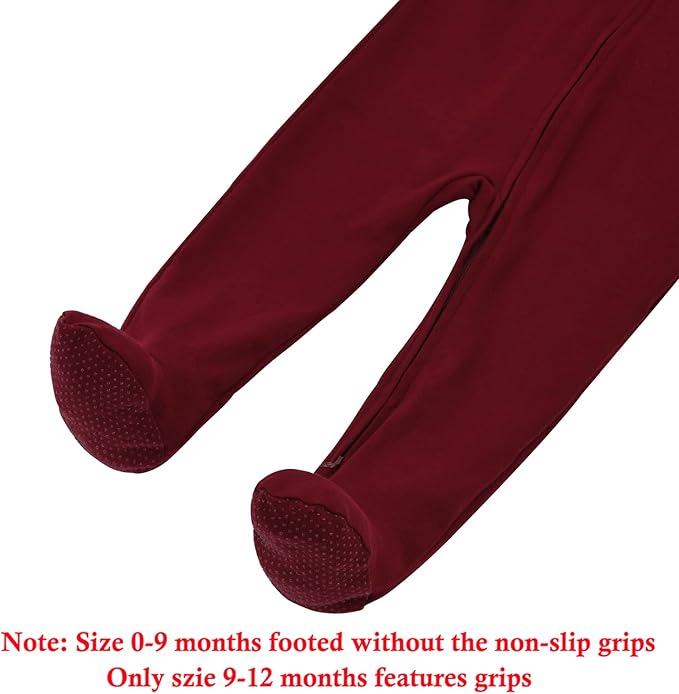- 【Built-in Mittens and Footed】All sizes design with reversible mitten hand covers to prevent baby from scratching themselves. This 9-12 months baby footie pjs features grip on the feet for extra stability. Great for little baby on the move(0-9 months size without non-slip grips)