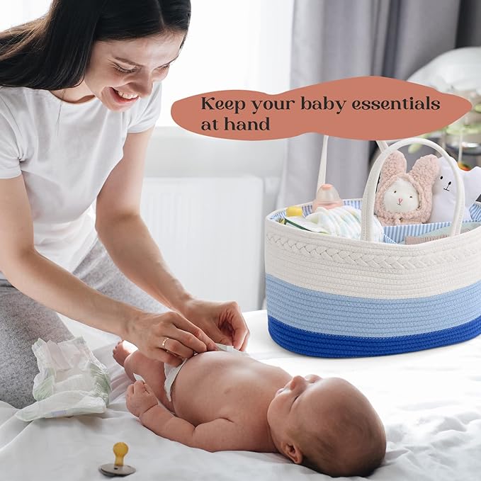 Baby Diaper Caddy Organizer, Extra Large Cotton Rope Nursery Diaper Basket, Changing Table Organizer, Portable Tote Bag with Divider, Car Storage, Baby Shower Gifts for Newborn Boys - Blue