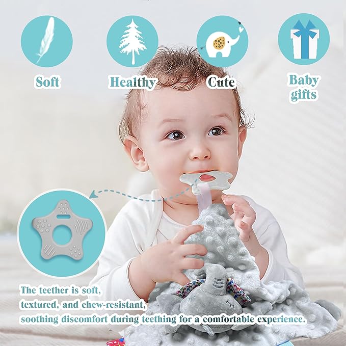 - Cuddly Design - Adorned with interactive and soothing satin loop tags for baby's sensory delight; The comforter with teether for babies to play with and soothe. Helps you and your baby tackle the challenges of teething together.Delight your little ones with its charming patterns, soothing teether, vibrant colors, and delightful sounds.