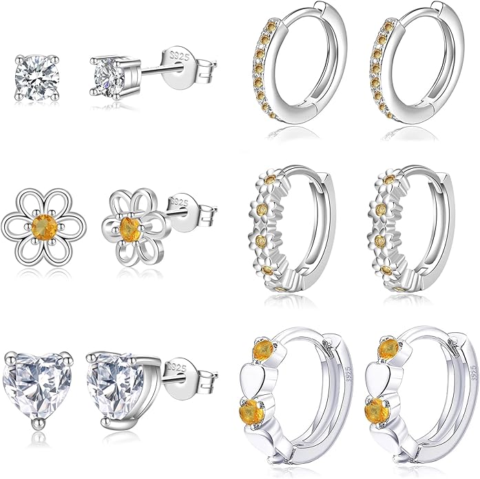 6 Pairs Huggie Hoop Earrings 925 Sterling Silver Stud Sets Cute Heart Hoops Tiny Cubic Zirconia Flower Stud Small Hypoallergenic Cartilage Sleeper Earrings