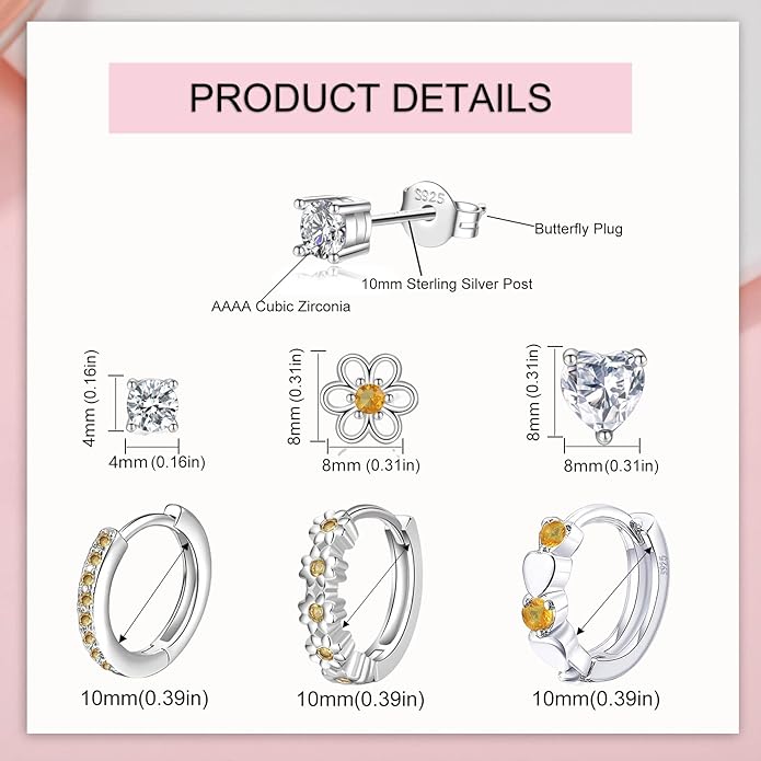 - Little Small Hoop Earrings:You can get 6 pairs of earrings in different styles, including round and heart cz studs, small flower studs, sparkling cubic zirconia huggie earrings, heart hoops earrings, and flower cluster hoop earrings. The dainty studs earrings are a classic style, sure to meet all your everyday needs.