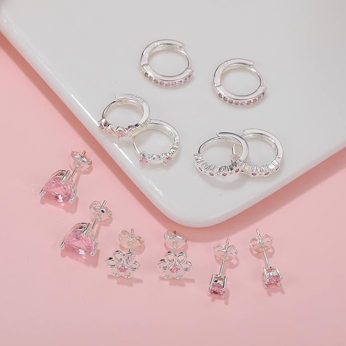 6 Pairs Huggie Hoop Earrings 925 Sterling Silver Stud Sets Cute Heart Hoops Tiny Cubic Zirconia Flower Stud Small Hypoallergenic Cartilage Sleeper Earrings