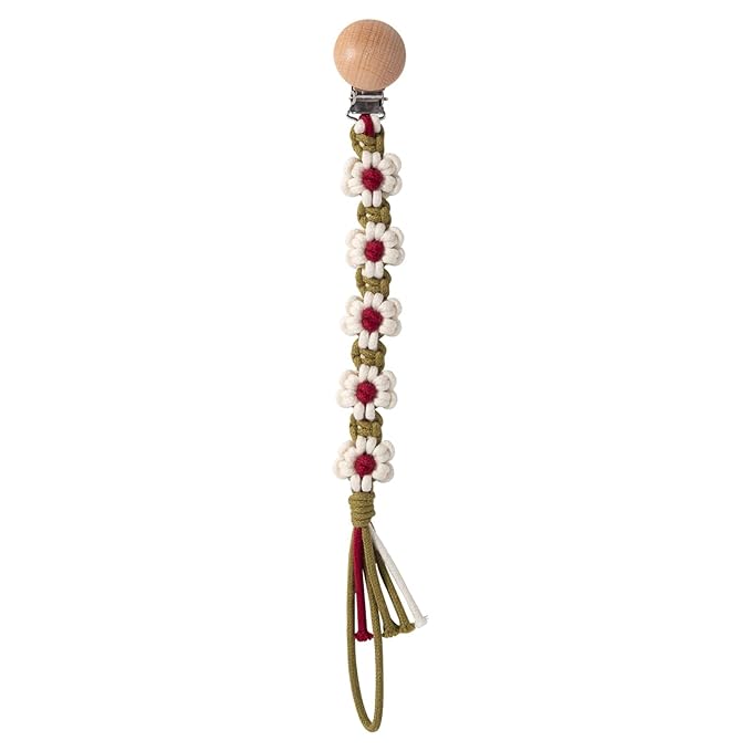 - 【Durable & Safety】Our personalised daisy pacifier clips are made with natural cotton cord and a beech wood clip, which are BPA Free, Phthalate Free, Latex Free, Lead Free. Round wooden clip with plastic teeth hold tight while hardly damage baby's clothes or discomfort the baby. Notice: Don't let your baby chew on the clips to avoid a choking hazard. Never leave baby unattended with a pacifier clip.