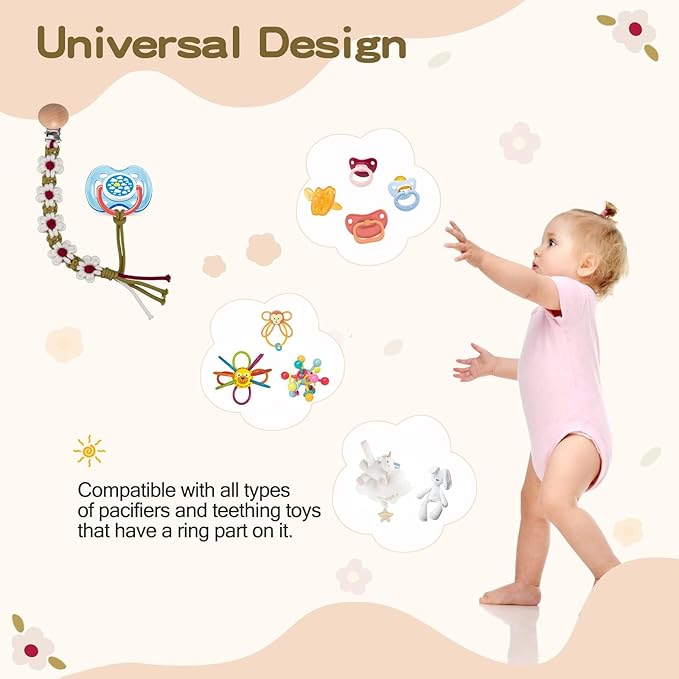 - 【Universal Fit】Works with almost all pacifiers, teething toys, teethers, soothies. These are the perfect accessory for your little one that will keep their pacifier off of that dirty floor and close by their mouths. Suitable for babies of all ages.