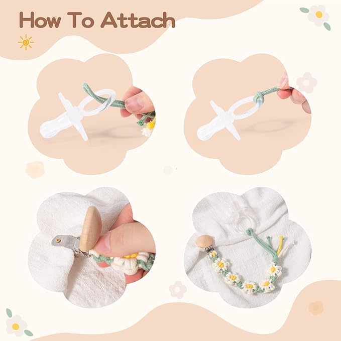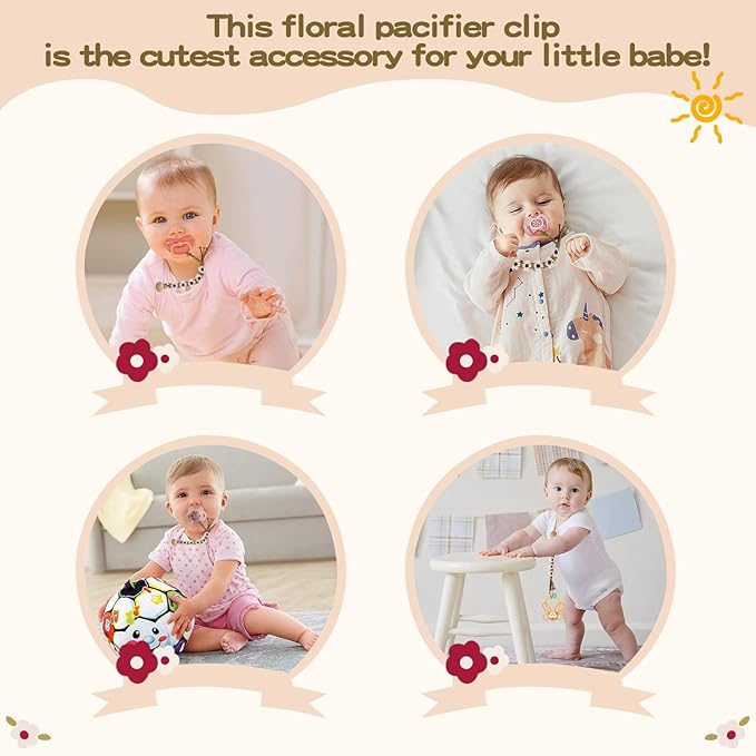 - 【Perfect Gift 】As each flower paci clip is handmade, there might be slight difference in size or appearance, making each one stand out! Pacifier clips for boys and girls, perfect baby shower gift or birthday gift. Create your unique pacifier clip today!