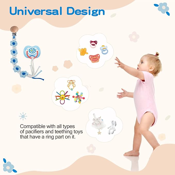 - 【Universal Fit】Works with almost all pacifiers, teething toys, teethers, soothies. These are the perfect accessory for your little one that will keep their pacifier off of that dirty floor and close by their mouths. Suitable for babies of all ages.