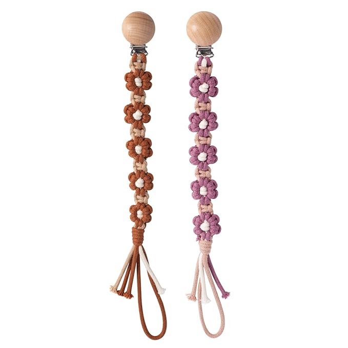• 【Durable & Safety】Our personalised daisy pacifier leash are made with natural cotton cord and a beech wood clip, which are BPA Free, Phthalate Free, Latex Free, Lead Free. Round wooden clip with plastic teeth hold tight while hardly damage baby's clothes or discomfort the baby. Notice: Don't let your baby chew on the clips to avoid a choking hazard. Never leave baby unattended with a pacifier clip.