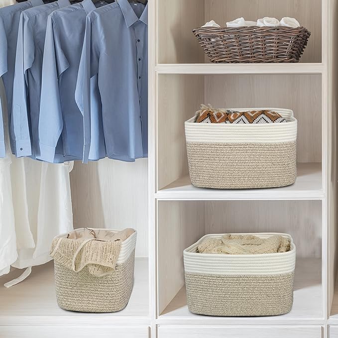 Cotton Rope storage Basket Bins Woven Basket for Organizing Shelves Rectangle Decorative Baskets For storage Clothes Toys Books Towels Square Wicker Nursery basket organizer 3 pack white and brown