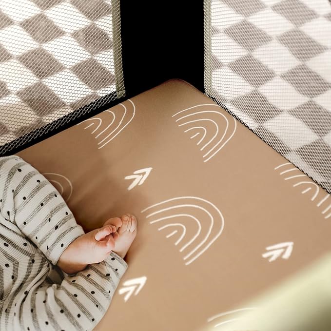 - Apple It Within Seconds: Thanks to the elastic bottom, our pack n play sheets come in a classic, the cute wild forest jungle bear/rainbow pattern that will put the finishing touches to any bedding. Make sure to give your darling a serene and calm bed to rest in.
