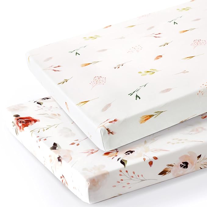 Stretchy Ultra Soft Jersey Knit Pack n Play Sheets Set 2 Pack, Portable/Mini Crib Sheets with Deep Pocket, Universal Fit Playard Pads Safe and Snug, Pretty Rose Flora for Girls, Orange Pink
