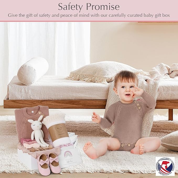 - Impressive Selection β Packaged in a chic, ready-to-gift box, it's the perfect present for any expecting parent. Personalize your gift with a custom message and have it delivered straight to the recipient's doorstep for a delightful surprise. Dimensions when wrapped: 12 inches x 9 inches x 4 inches. Make every baby shower memorable with our exclusive collection! Items include a long sleeved knitted onesie, a set of baby muslin swaddle blanket, a pair of baby moccasins, a baby comfort bunny, a wooden rattle, 3 baby girl headbands, and a greeting card