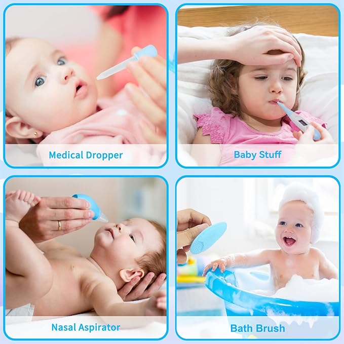 - 【DESIGNED FOR BABY】Each of the baby care set's accessories is designed specifically for babies. Soft silicone brushes, round head design combs and bristle combs, baby hair care and bath set, gentle and non-invasive; medicated feeding spoon and dropper with scale, more accurate and convenient to feed baby; nose cleaner and baby tweezers, small and flexible tips, more comfortable for baby.