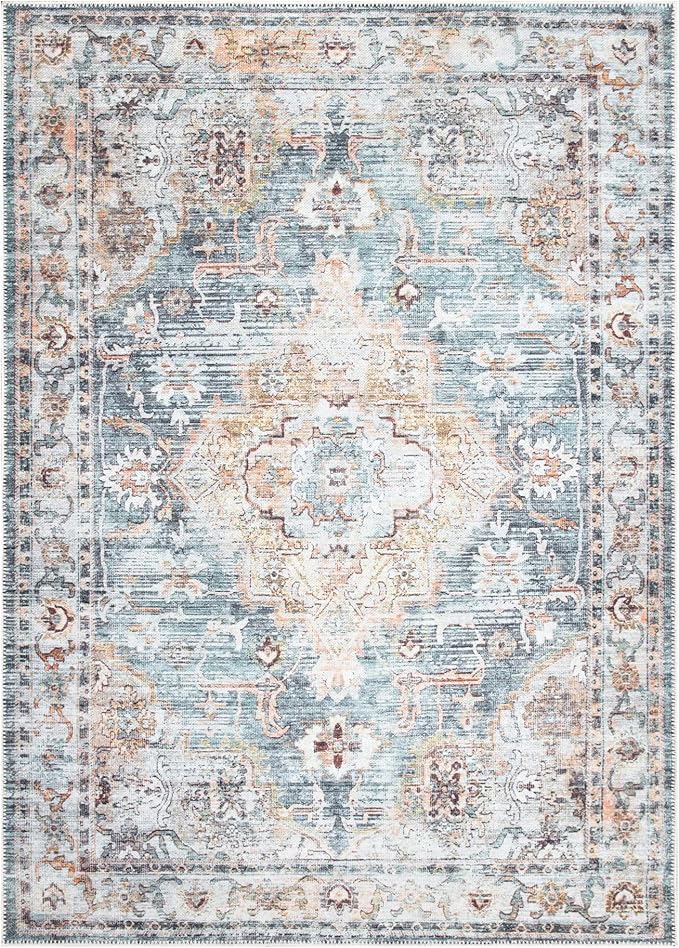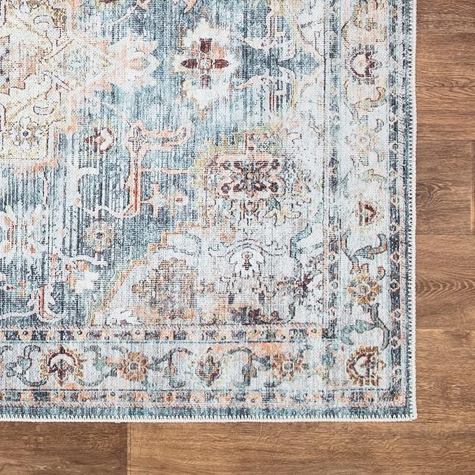 Bloom Rugs Washable Non-Slip 4' x 6' Rug - Teal/Peach Traditional Area Rug for Living Room, Bedroom, Dining Room, and Kitchen - Exact Size: 4' x 6'