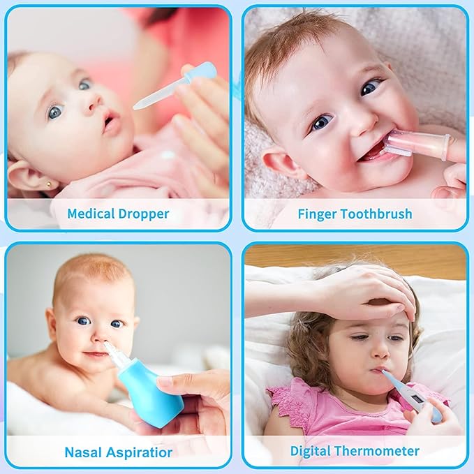 - 【SPECIALLY DESIGNED FOR BABY】1. Grooming set: scissors with round blades, round teeth, comb with soft brush, gentle and non-irritating, suitable for baby's hair grooming and bath use; 2. Plastic tweezers, nasal aspirator and nail clipper with stopper to ensure baby's safety and comfort when using; 3. Dropper measuring with scale, convenient for you to measure the amount accurately, comfortable silicone finger toothbrush to clean baby's teeth and tongue.
