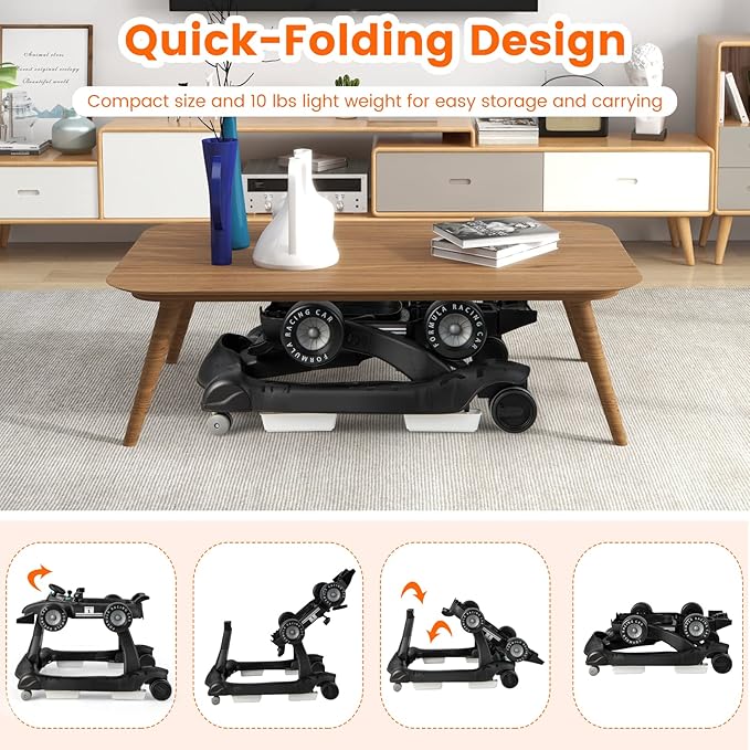 HONEY JOY 4-in-1 Baby Walker, Activity Push Walker w/3 Adjustable Heights, Smooth Wheels w/Adjustable Speed, Padded Seat, Music & Light, Foldable Car Walker for Baby Boys Girls Age 6 Months+ (Black)