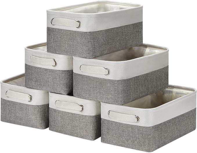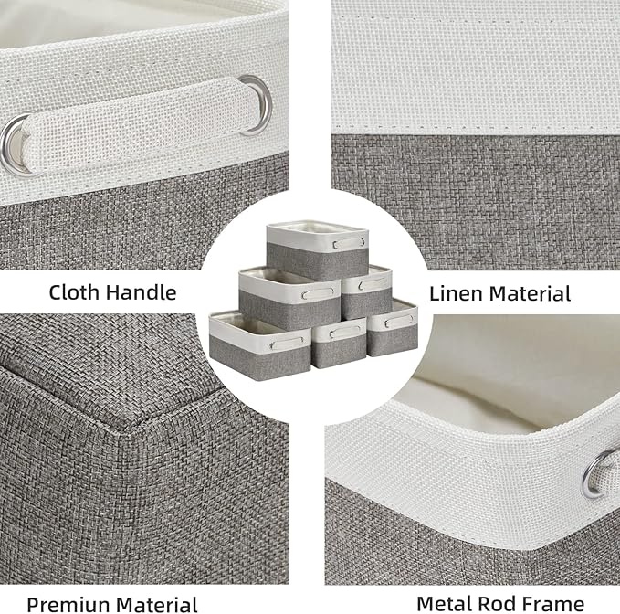 HNZIGE Small Organizer Bins for Shelf,Small Fabric Collapsible Baskets for Organizing Nursery Linen Canvas,Set of 6 Decorative Storage Basket for Storage Closet Toy(White&Gray, 11.8" x 7.8" x 5.1")