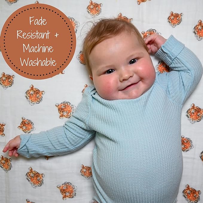 LollyBanks 100% Cotton Muslin Swaddle Blanket, Large 47 x 47 Inches, Tiger Theme, Orange, Modern Animal Print, Breathable and Lightweight, Baby Care, 1 Count