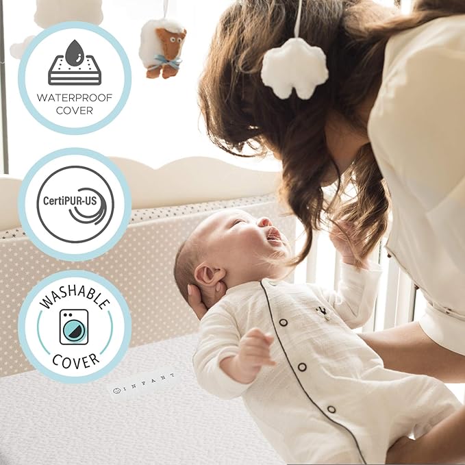 - FIRM & FLAT FOR FRAGILE NEWBORNS | Create a Safe, Secure Crib Environment During Those Early Days! | Infant Side is Constructed of High Density Foam with Optimal Firmness, Ideal Thickness, Flat Surface & Stable Edges—Just What Babies Need to Support Their Growing Bones & Reduce Hazard as They Learn to Move