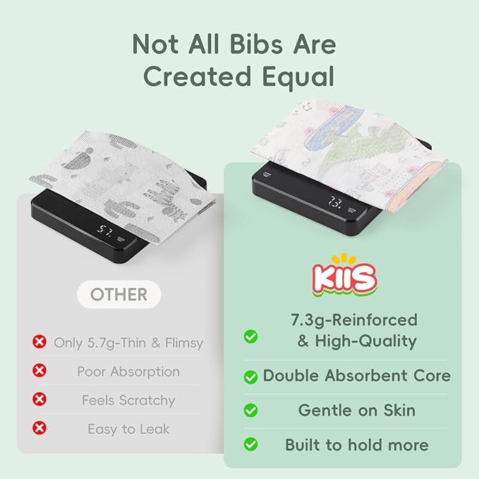 - Comfortable & Reliable: Our waterproof toddler bib is made of a four layer of fabrics, with the first layer being a non-woven fabric, skin-friendly, and comfortable to wear. KIIS Baby Disposable Bibs is also breathable and waterproof, keeping your baby's clothes clean and dry after feeding. Additionally, the fabrics contain no harmful chemicals such BPA, PVC, Phthalates, lead, or toxins making the bib super safe for babies and toddlers.