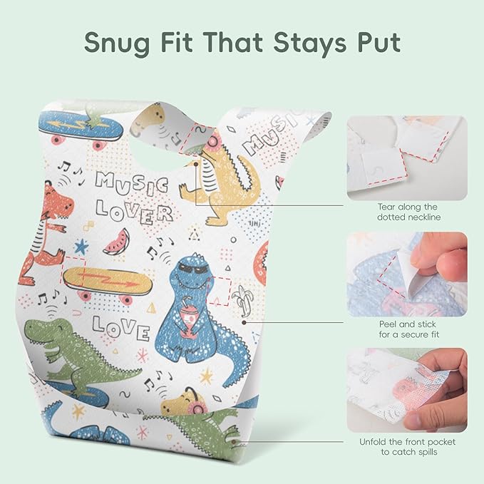 - Easy To Use: Disposable Bibs is perfect for home or on the go, using the bibs when having snacks or having a meal without concern for dirt, harsh cleaning chemicals, and keeping babies' clothes clean. Just peel off the tape and stick it on the clothes. Because it is a disposable product, it is very light and can be carried with you. Just fold it and throw it away. You don’t need additional cleaning or drying like ordinary cloth bibs.