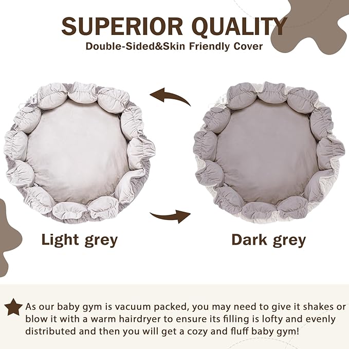 - NOTE: To maintain the pristine condition, our play gym is carefully vacuum packed. After receiving the package, shake it or use a blow dryer to restore its shape and volume. Plus, do not leave your baby alone on the mat; use it under adult supervision for optimal safety.