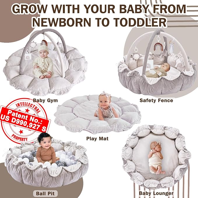 - 5-IN-1 CONVERTIBLE BABY GYM: Our tummy time mat is a perfect combination of baby gym, baby nest, play mat, ball pit and fence, creating a safe and enclosed play area. The versatile design offers various entertainment for kids, making tummy time more enjoyable.