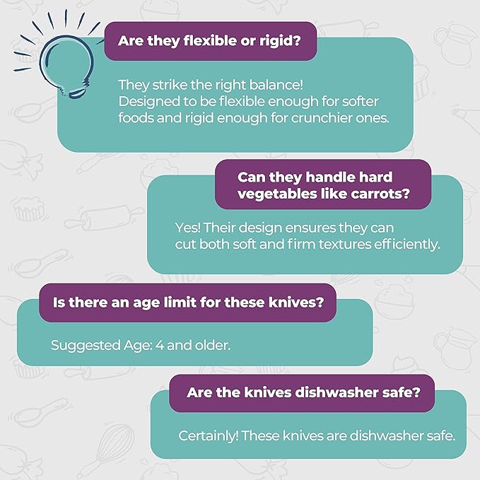 - Child-Safe Knives: Our set includes three kid-safe knives in different sizes and colors, allowing your little chef to get started in the kitchen with confidence.