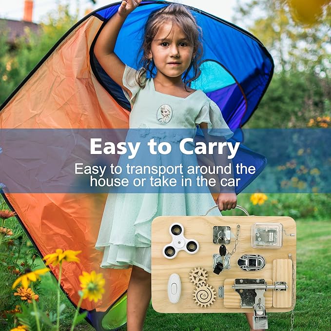 - Great Sensory Toy: The wooden busy board includes 9 different activities that keep your child busy and engaged, teaching kids the basic workings of everyday life in a simple, non-tech way.