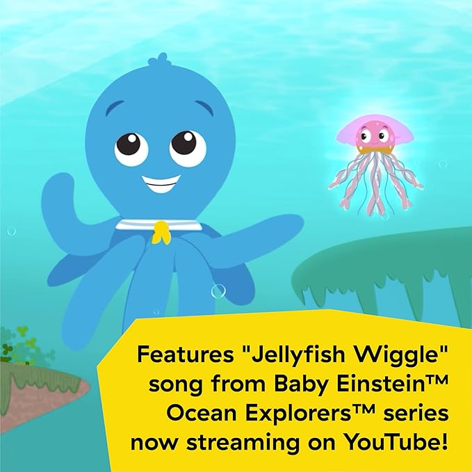 - Eight plush arms respond to baby’s slightest touch; Features 4 songs from Baby Einstein Ocean Explorers YouTube series with volume control; Requires 3 AA batteries; Dimensions: 9.4 x 9.4 x 9.0 inches