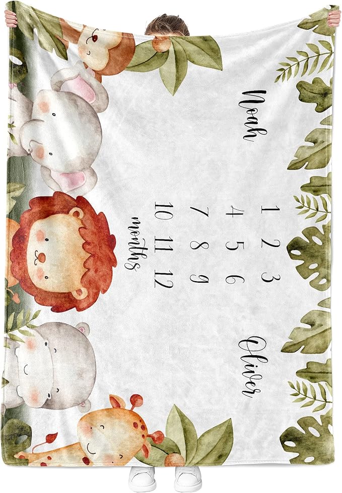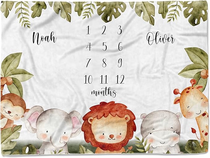 MDPrints Global Personalized Twin Milestone Blanket, Custom Monthly Baby Blankets with Name for Boys and Girls, 30x40 & 50x60inch Soft Plush Fleece (Safari 541)